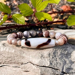Die gestreifte Dzi Perle steht für Wandel und Veränderung. Laut Überlieferung soll er wie ein Transformator wirken und alle negativen Ereignisse, Situationen und Energien ins Positive verändern können. Das Leben des Trägers soll sich so grundlegend zum Besseren fügen, Glück und Wohlstand anziehen und die berufliche Stellung verbessern können.