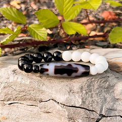 Man sagt, er soll ein angenehmes Leben bescheren und in Kombination mit anderen Dzi Perlen sehr kraftvoll sein. Er verdeutlicht den Sinn von positiven, aber auch negativen Einflüssen im Leben, denn alles im Leben hat eine Berechtigung, um die Geschenke des Lebens als solche wertzuschätzen. Er soll anregen, seine Lebenssituation zu reflektieren und aus jeder schlechten Erfahrung neue Kraft und Energie zu schöpfen, die zu einem harmonischen Leben beitragen.